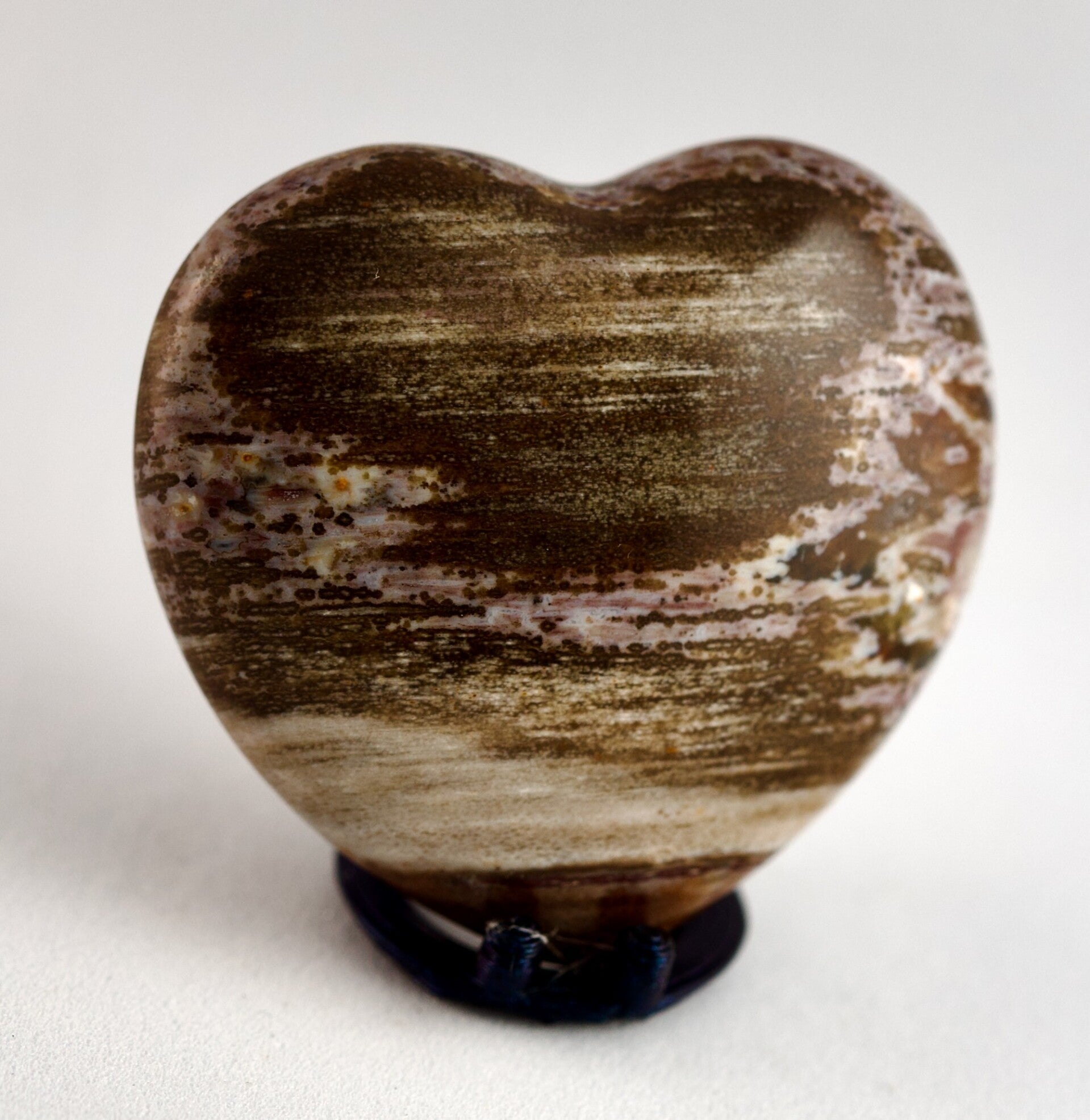 Each polished heart is opaque and richly patterned, showcasing its own unique blend of earthy tones, from soft beige and mossy greens to warm browns and deep reds. No two are ever the same, making every piece entirely individual.